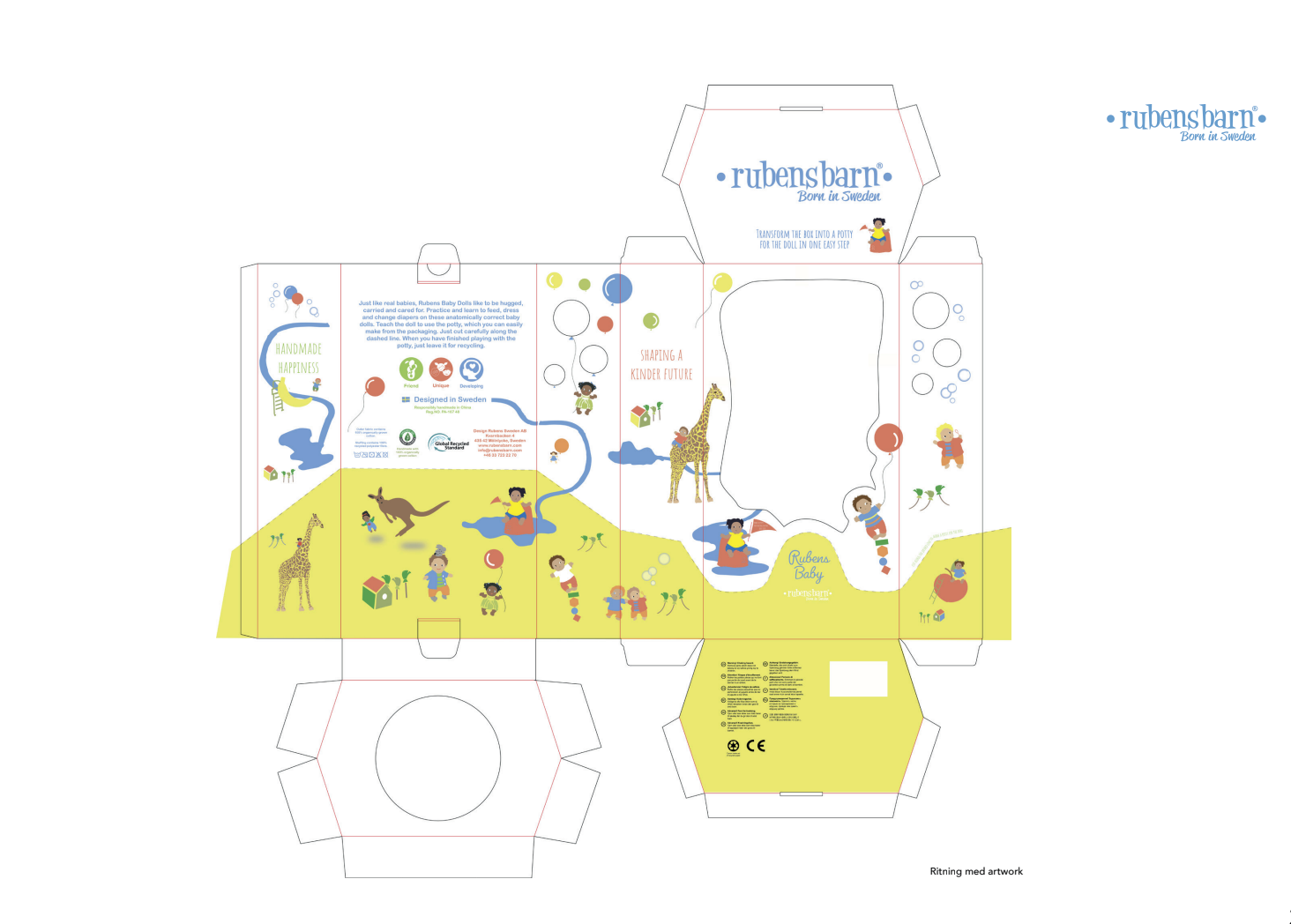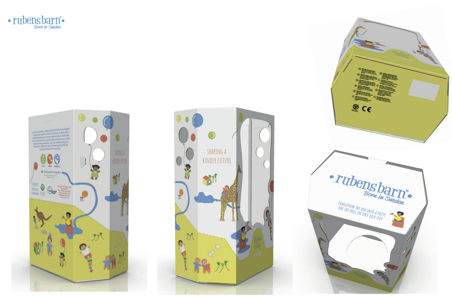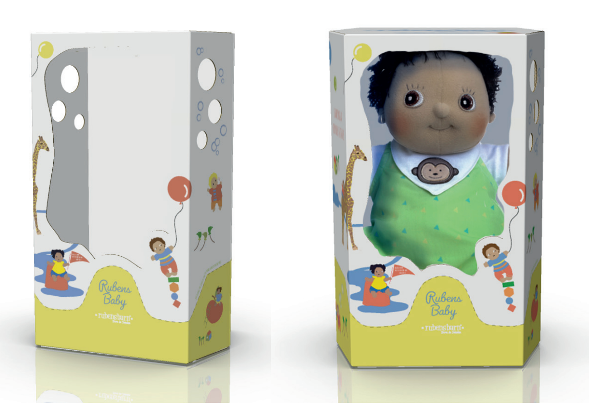 En förpackning till en ny docka från Rubens barn. Förpackningen kan förvandlas till en potta åt dockan.
